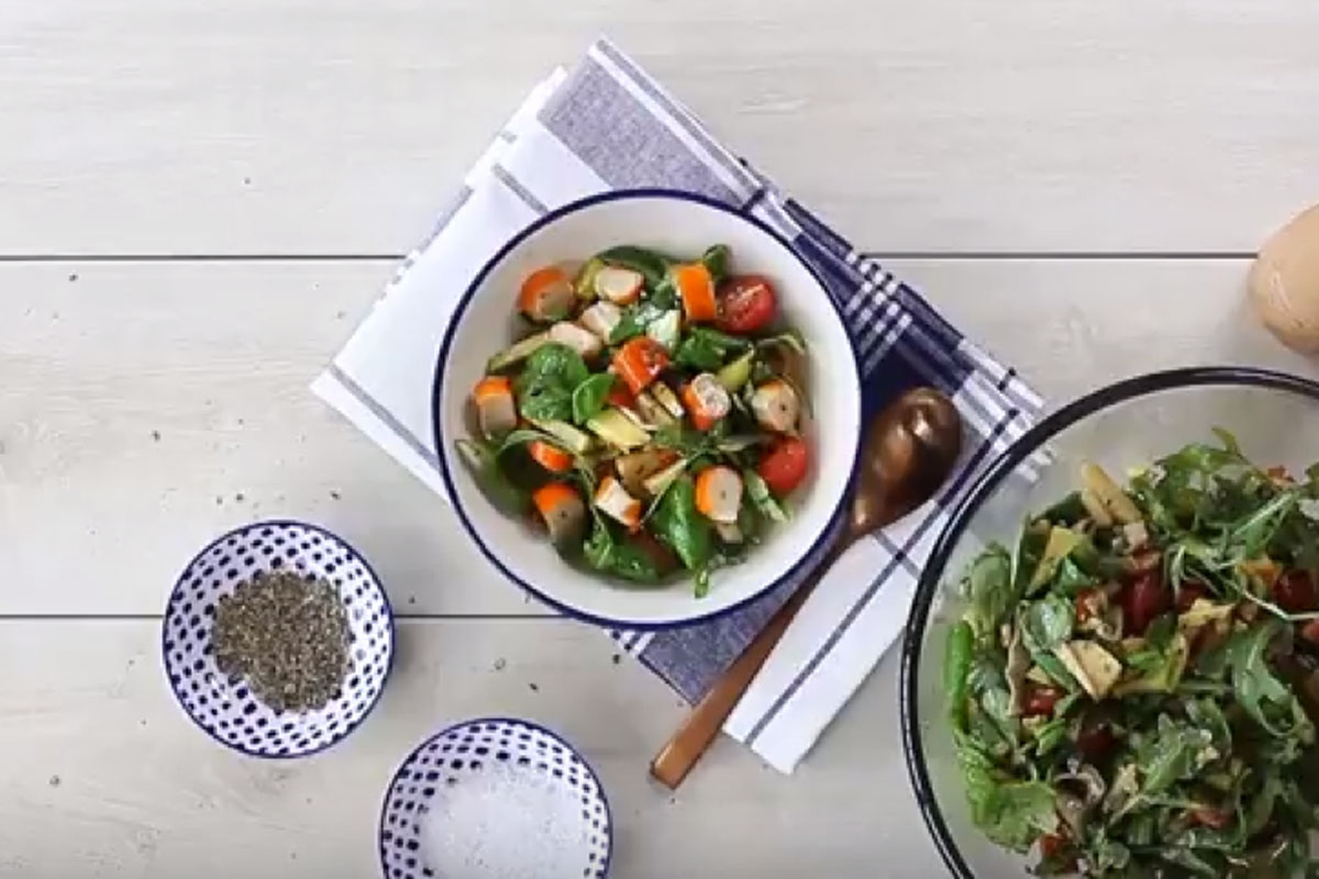 En un bol, echar los canónigos y la rúcula. Trocear en dados y añadir los palitos de Surimi. Trocear la manzana y el aguacate, picar un puñado de nueces y añadir todo. Añadir una cucharadita de huevas de salmón y remover hasta mezclar bien todos los ingredientes. Espolvorear albahaca.