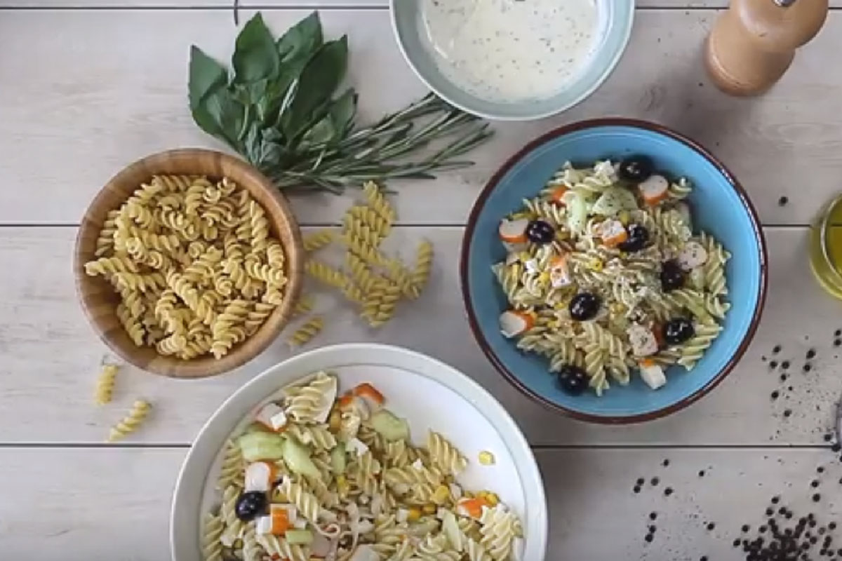 Cocer la pasta según las indicaciones del envase, escurrir, enfriar y reservar. Pelar el pepino, trocear y reservar. Trocear el queso fresco en dados. Trocear los palitos de Surimi. En un bol, echar la pasta cocida, el pepino, el queso, el maíz dulce, las aceitunas negras y los palitos de Surimi. Remover ligeramente para que se mezclen los ingredientes.
