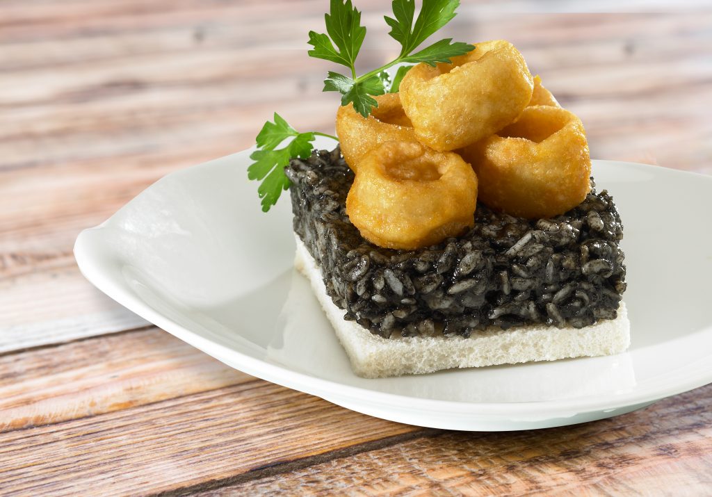 Tosta de arroz negro y chipirones.